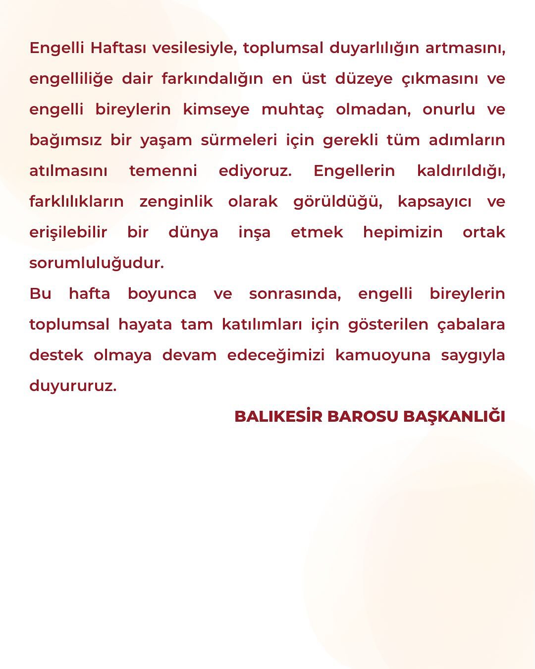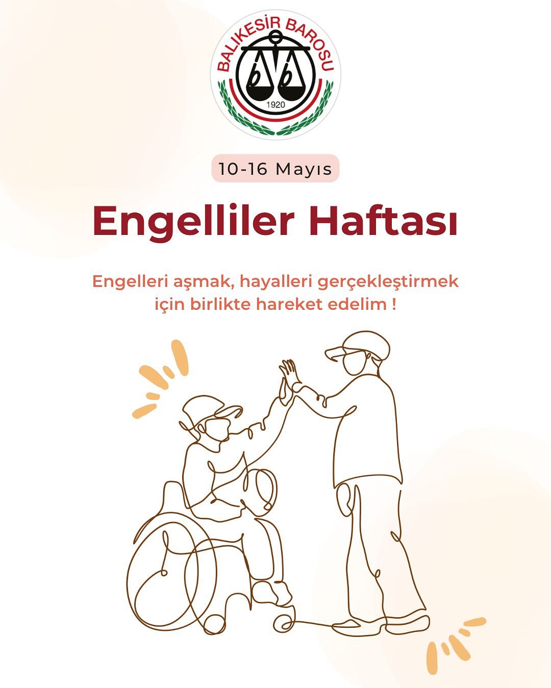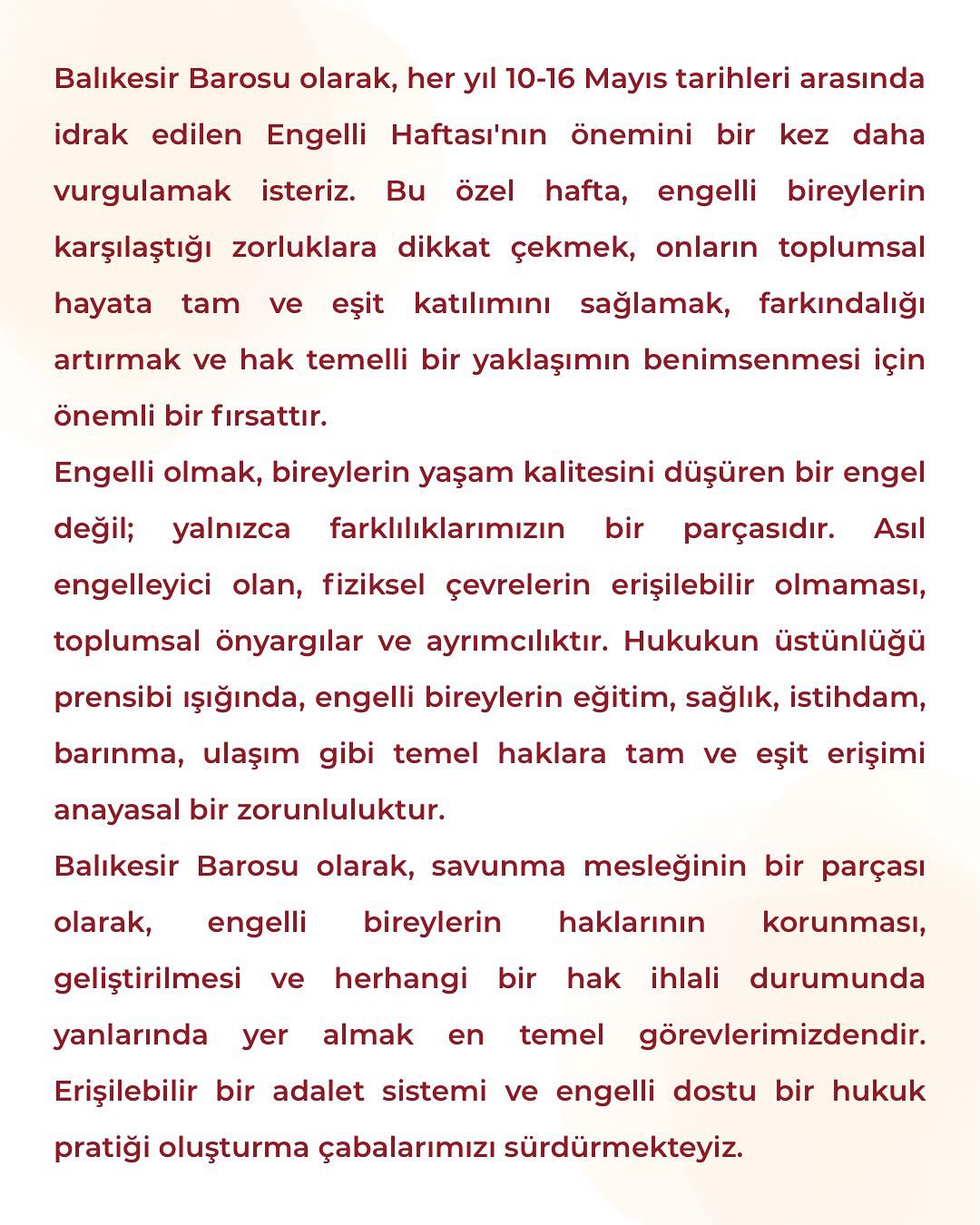 Balıkesir Barosu olarak, her yıl 10-16 Mayıs tarihleri arasında idrak edilen Engelli Haftası’nın önemini bir kez daha vurgulamak isteriz. Bu özel hafta, engelli bireylerin karşılaştığı zorluklara dikkat çekmek, onların toplumsal hayata tam ve eşit katılımını sağlamak, farkındalığı artırmak ve hak temelli bir yaklaşımın benimsenmesi için önemli bir fırsattır.