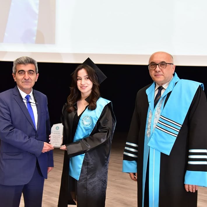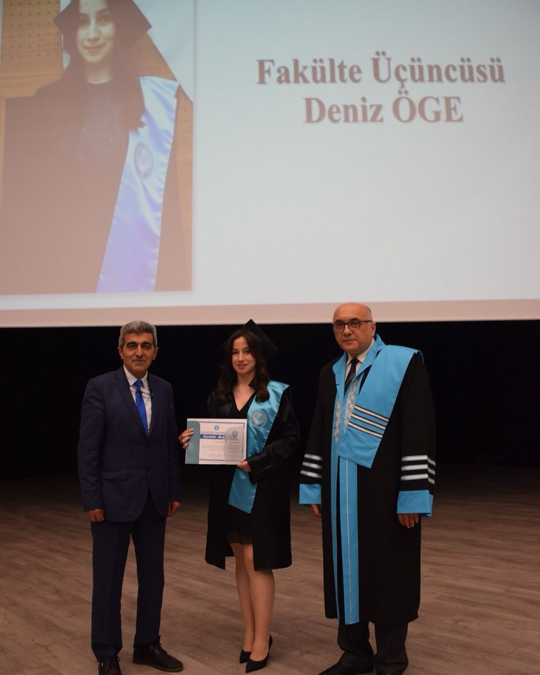 Fakülte Üçüncüsü Deniz ÖGE’nin plaket ve diploması, Baro Başkanımız Hakan TOPALOĞLU tarafından verilmiştir.