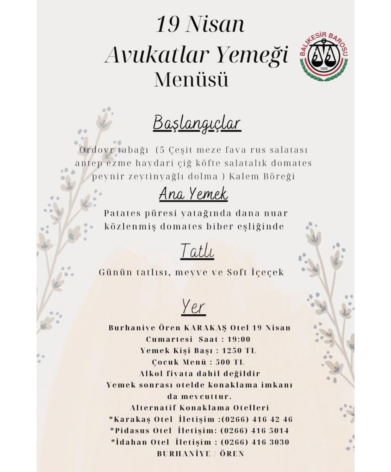 5 Nisan 2025 Cumartesi günü yapılması planlanıp iptal edilen Avukatlar günü yemeği, 19 Nisan Cumartesi Günü saat 19.00’da Burhaniye Karakaş Otel’de yapılacaktır. Yemek Ücreti kişi başı 1.250,00 TL olup, alkol fiyata dahil değildir. Yemek sonrası ayrıca konaklama imkanı da mevcuttur. Katılım sağlamak isteyen meslektaşlarımızın en geç 16.04.2025 Çarşamba günü baro personeline isimlerini yazdırmaları ve aynı tarihe kadar ödemeyi yine baro personeline yapmaları gerekmektedir.