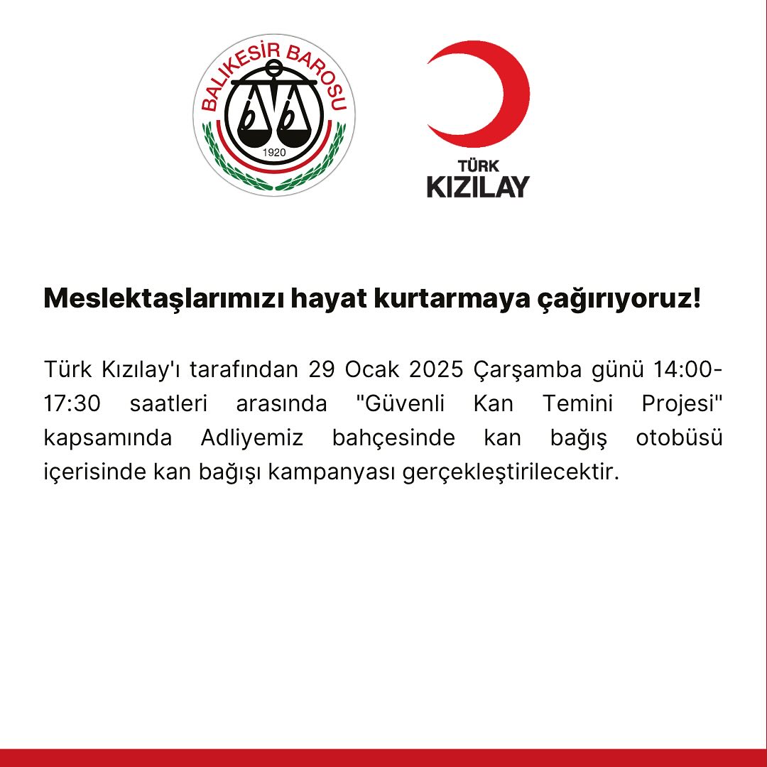 Türk Kızılay’ı tarafından 29 Ocak 2025 Çarşamba günü 14:00-17:30 saatleri arasında “Güvenli Kan Temini Projesi” kapsamında Adliyemiz bahçesinde kan bağış otobüsü içerisinde kan bağışı kampanyası gerçekleştirilecektir.