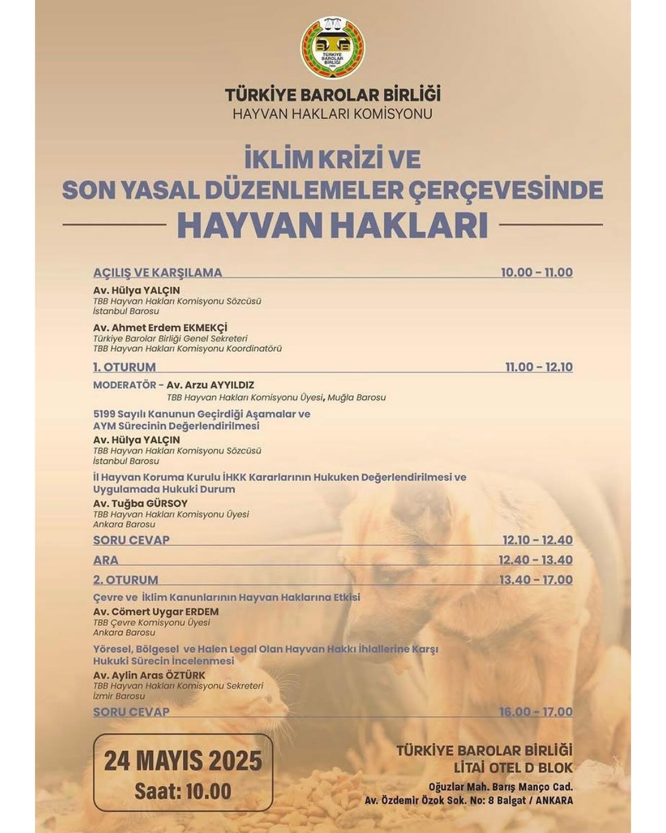 Türkiye Barolar Birliği Hayvan Hakları Komisyonu tarafından 24 Mayıs 2025 tarihinde Türkiye Barolar Birliği Litai Otel’de “İklim Krizi ve Son Yasal Düzenlemeler Çerçevesinde Hayvan Hakları” konulu panel düzenlenecektir.